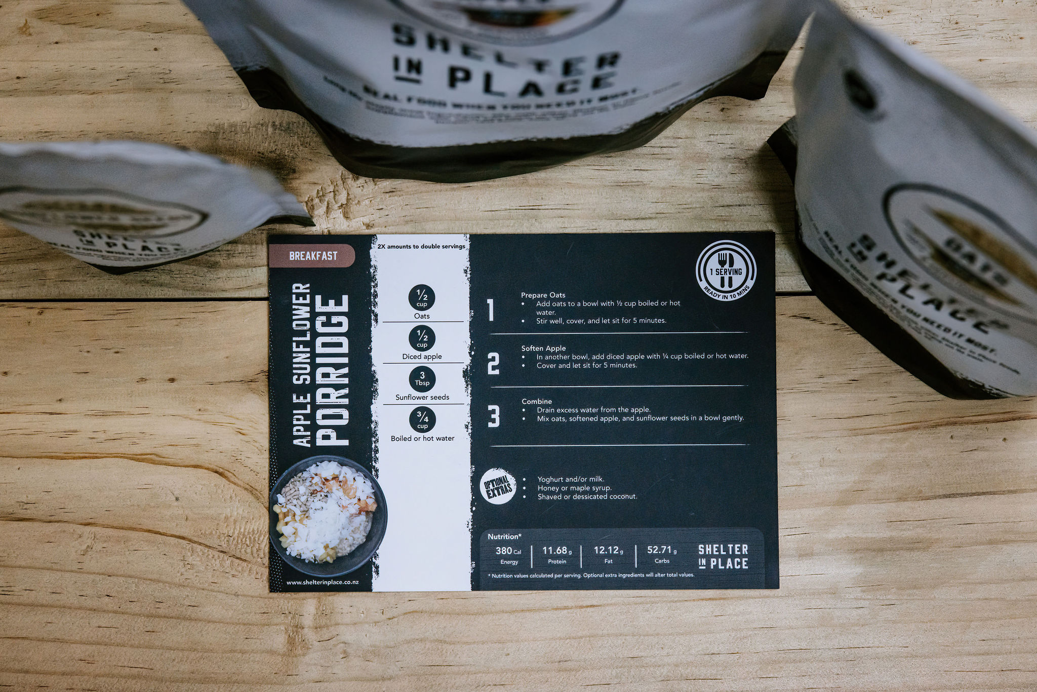 A no-cook breakfast made for shelter-in-place situations, power outages, or lightweight hiking fuel. With oats, apple, and sunflower seeds, it's cozy, energizing, and ready in minutes — no stove needed.