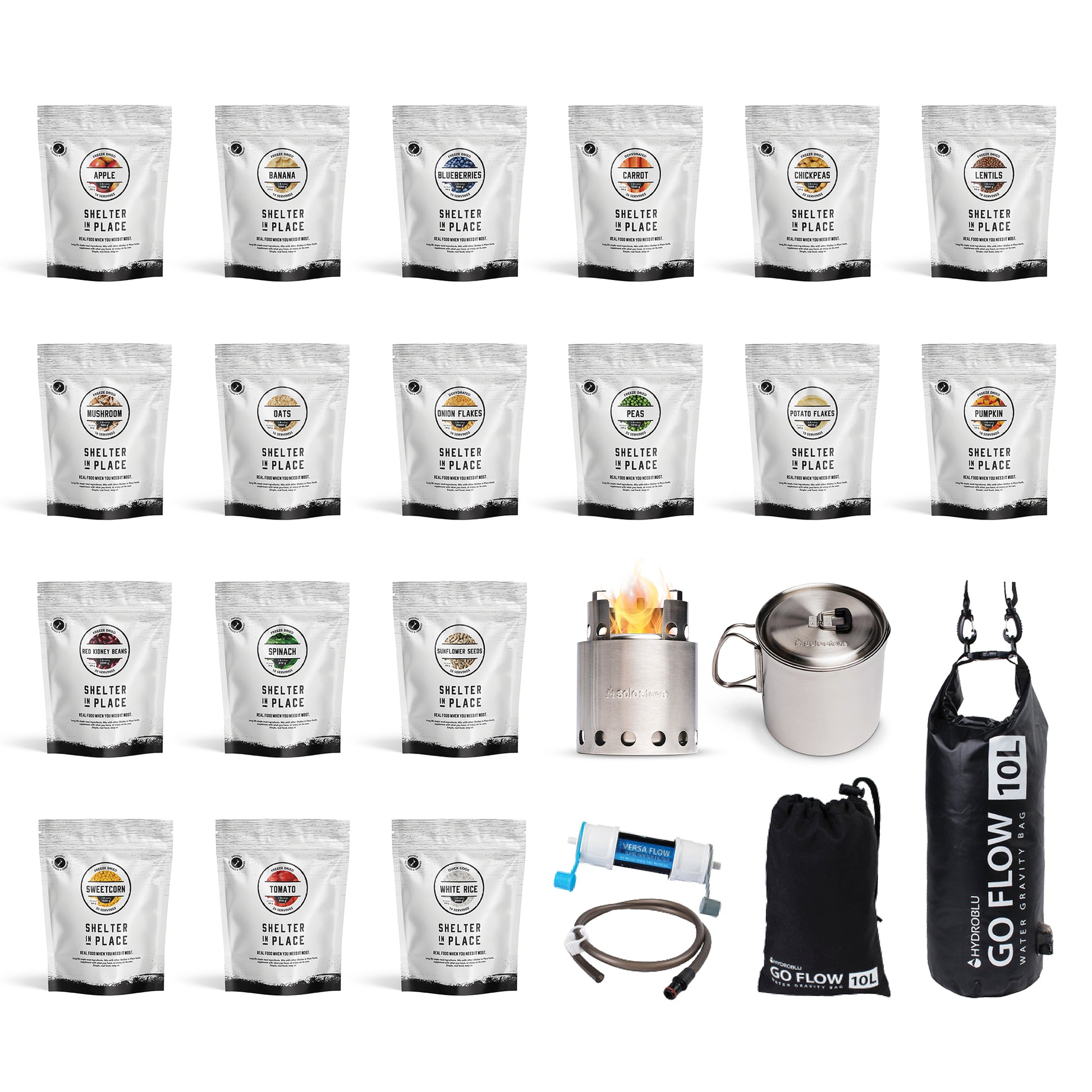 Prepare for "What If?" with our Shelter In Place Complete Kit—your all-in-one emergency solution. Complete with 18 versatile, long-life meal ingredients (mix of freeze dried and dehydrated fruits, grains, and vegetables plus a 1-week meal plan for family-friendly recipe ideas), a wood-fueled stove, a durable multipurpose pot, and a reliable water filtration unit.